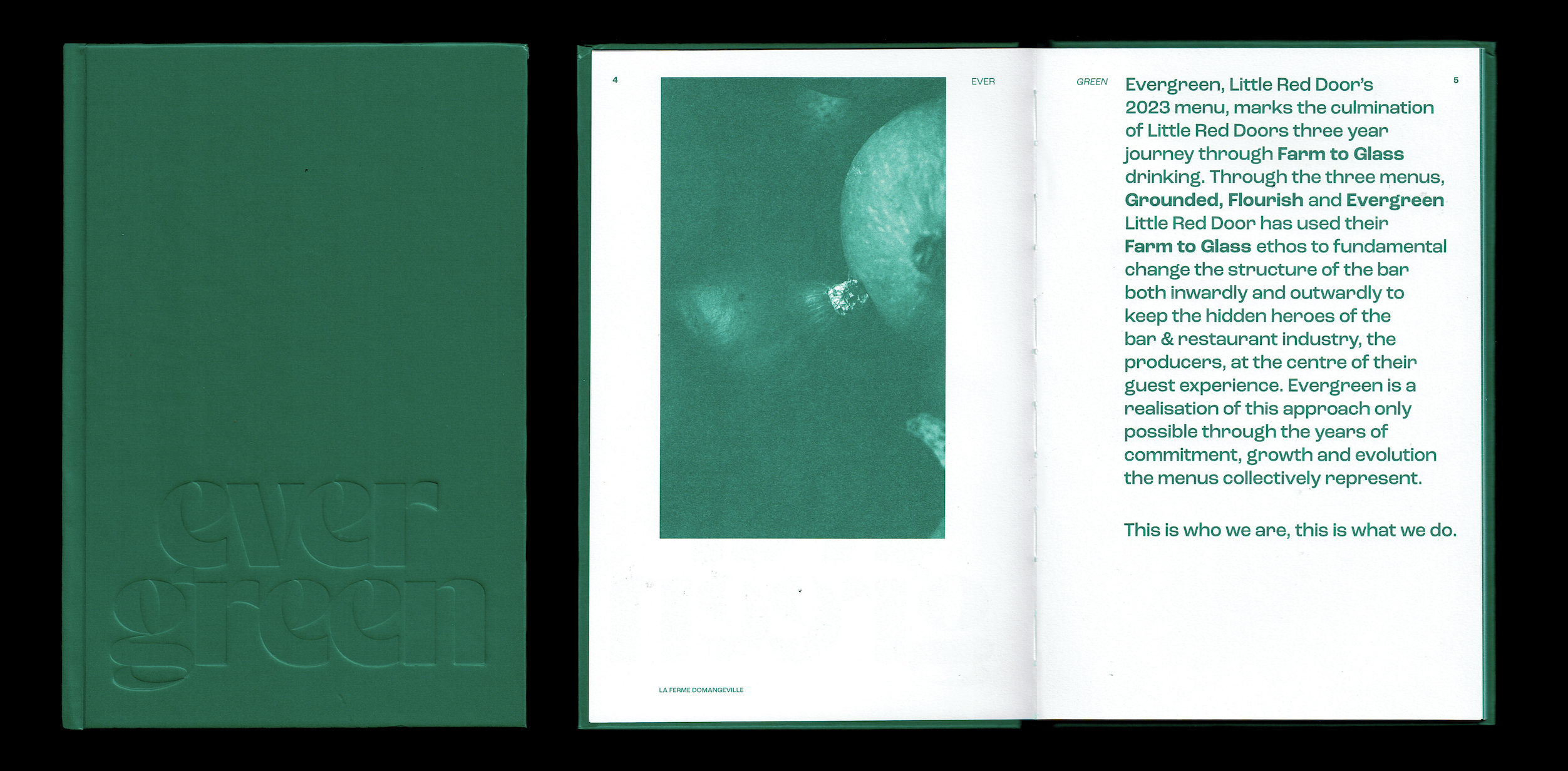 Au Little Red Door, Evergreen marque l’aboutissement d’une trilogie. Après Grounded en 2021 et Flourish en 2022, ce nouveau menu, lancé mi-mars 2023, permet au bar à cocktails parisien de faire valoir la créativité de ses bartenders autour d’une démarche allant de la ferme au verre.Directrion Artistique, Edition, Tee Shirt, Com Réseaux Sociaux
