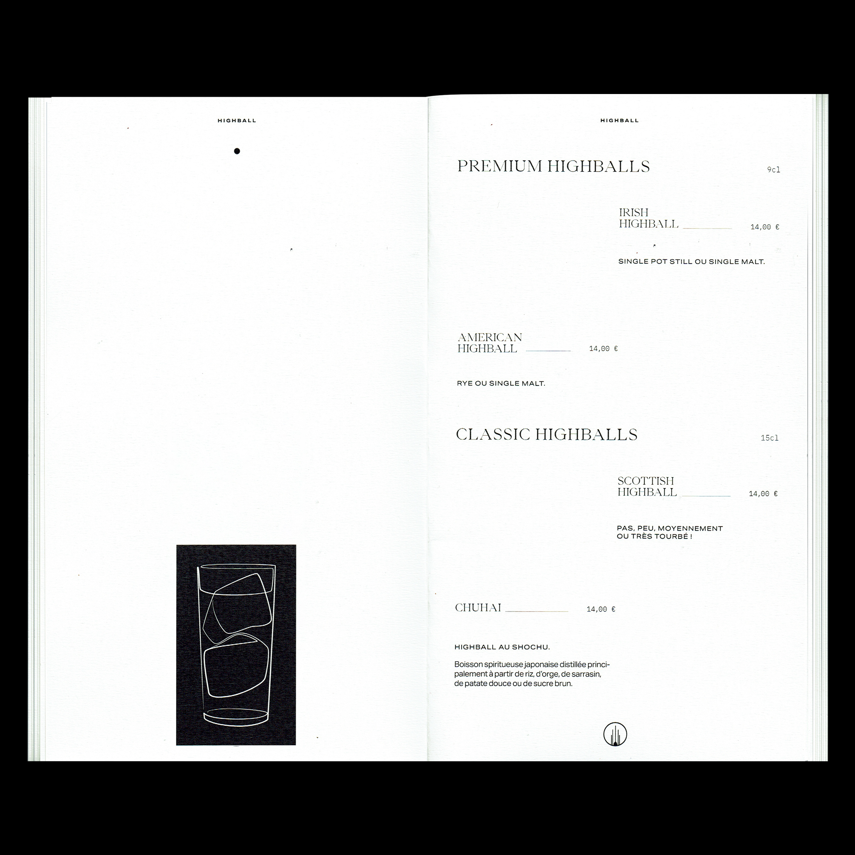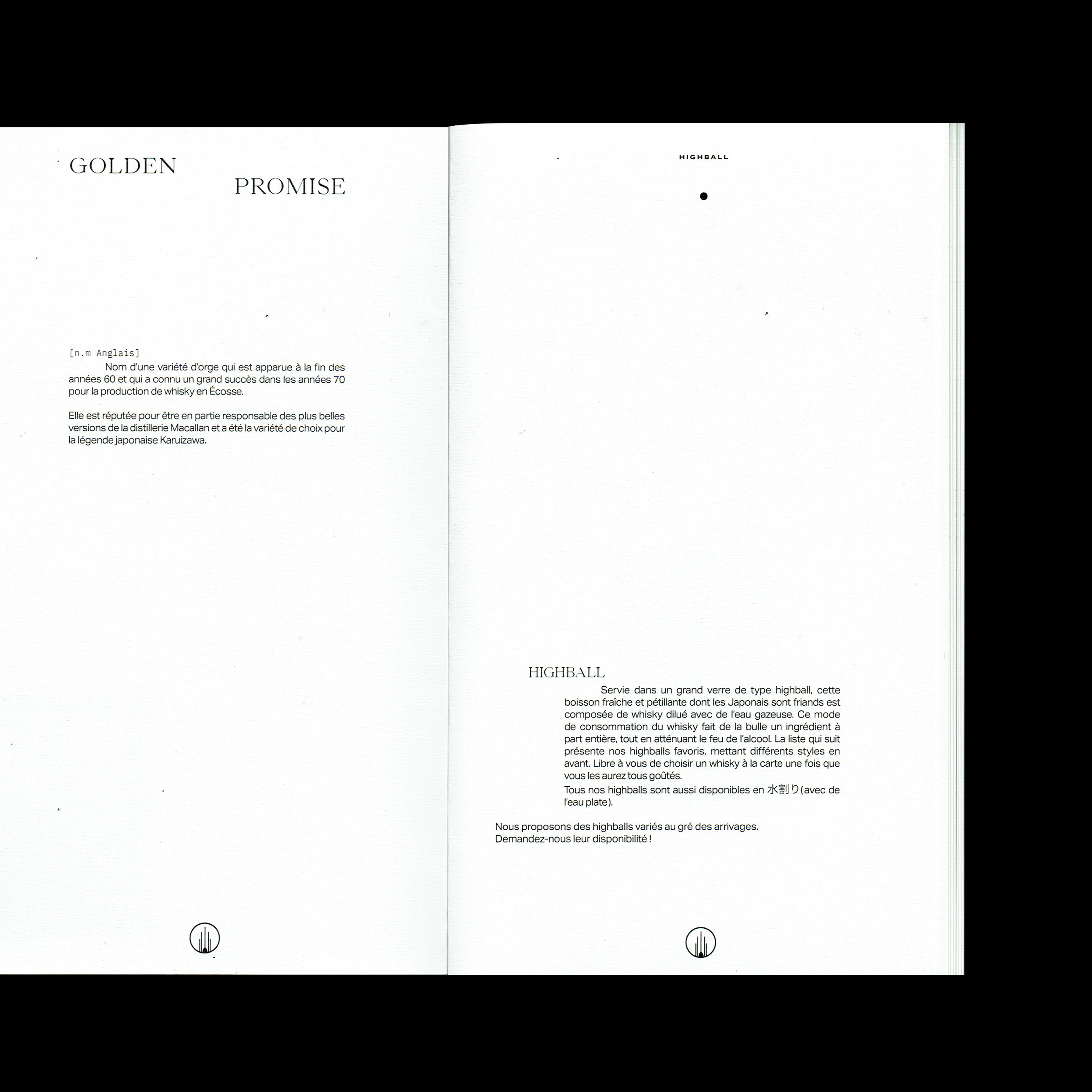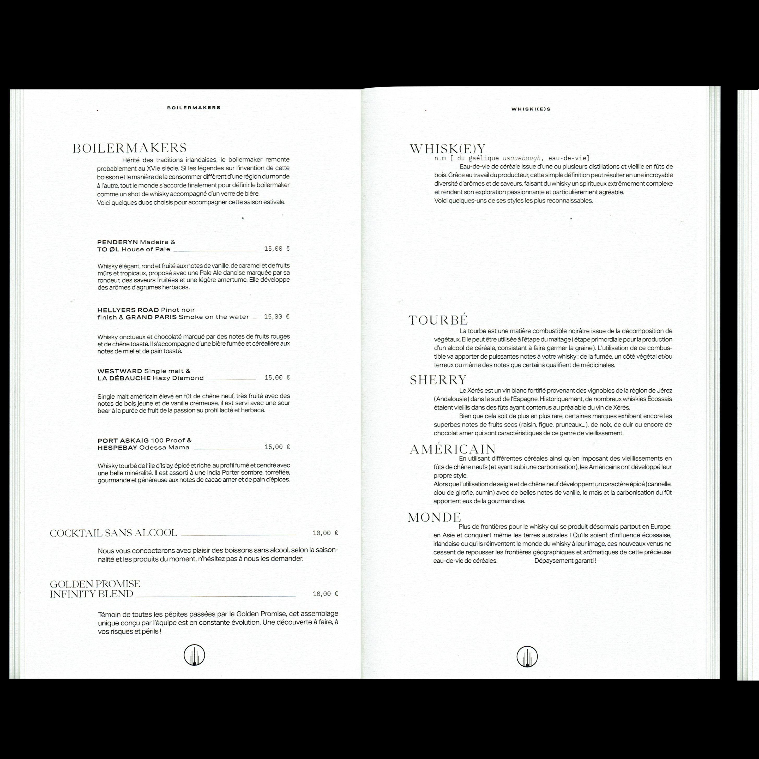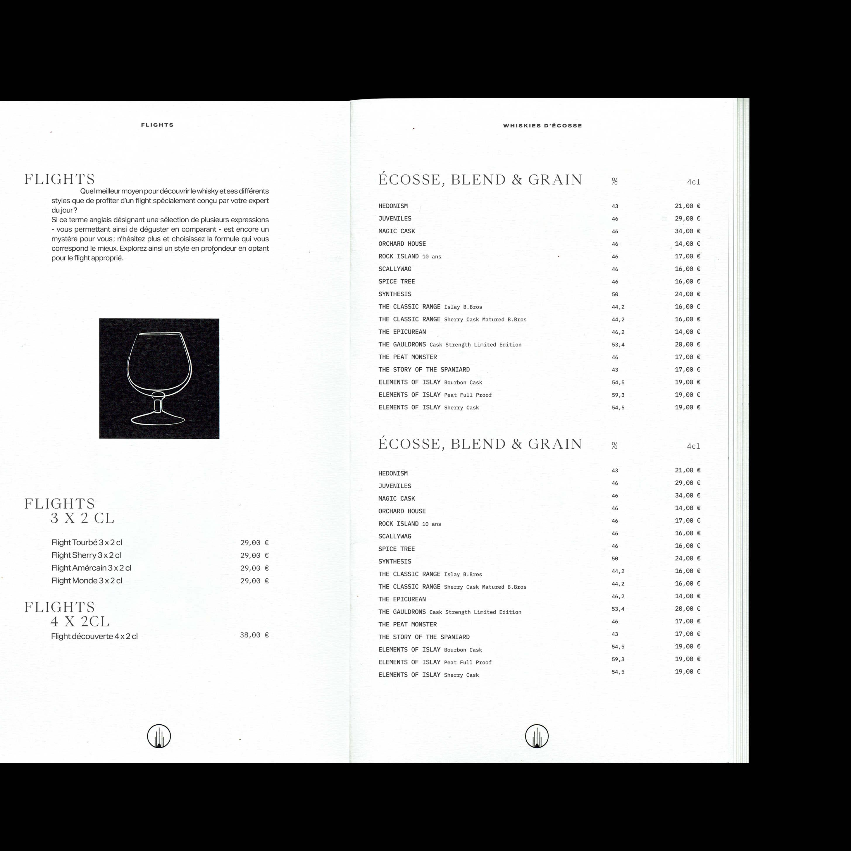 Dans une atmosphère calfeutrée et propice à la dégustation, le lieu propose deux espaces. Le premier est dédié au whisky décliné en cocktails, sous ses formes les plus mythiques, mais aussi de nombreuses créations originales. Le second est réservé à la dégustation de whiskies rares, avec plus de 1 000 embouteillages, dont la plupart sont presque introuvables. Des single malts bien sûr, avec une sélection impressionnante de scotchs, et de japonais anciens, mais aussi de vieux pure malts et blended whiskies, qui témoignent tous à leur manière du savoir-faire d'époques révolues.