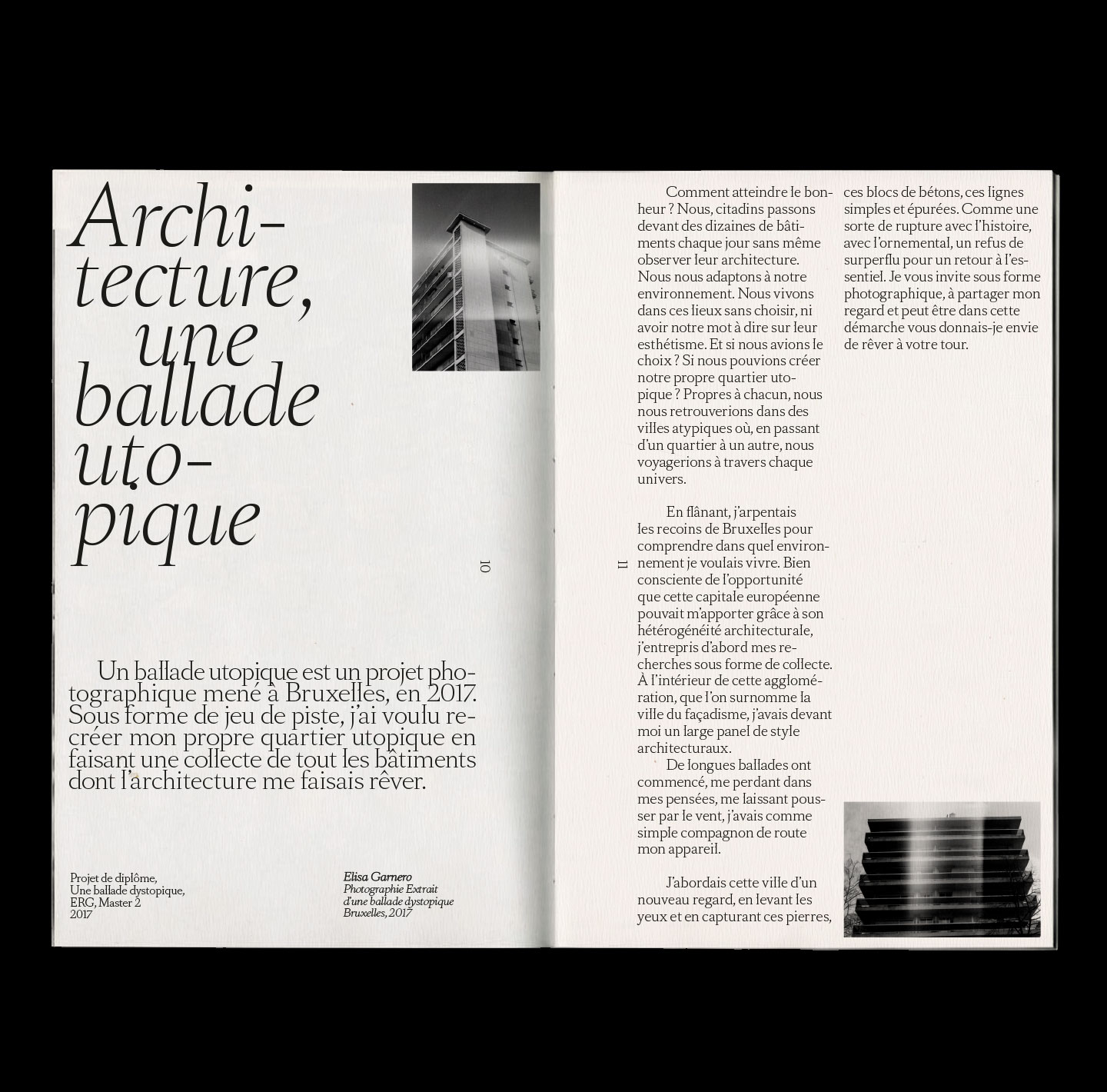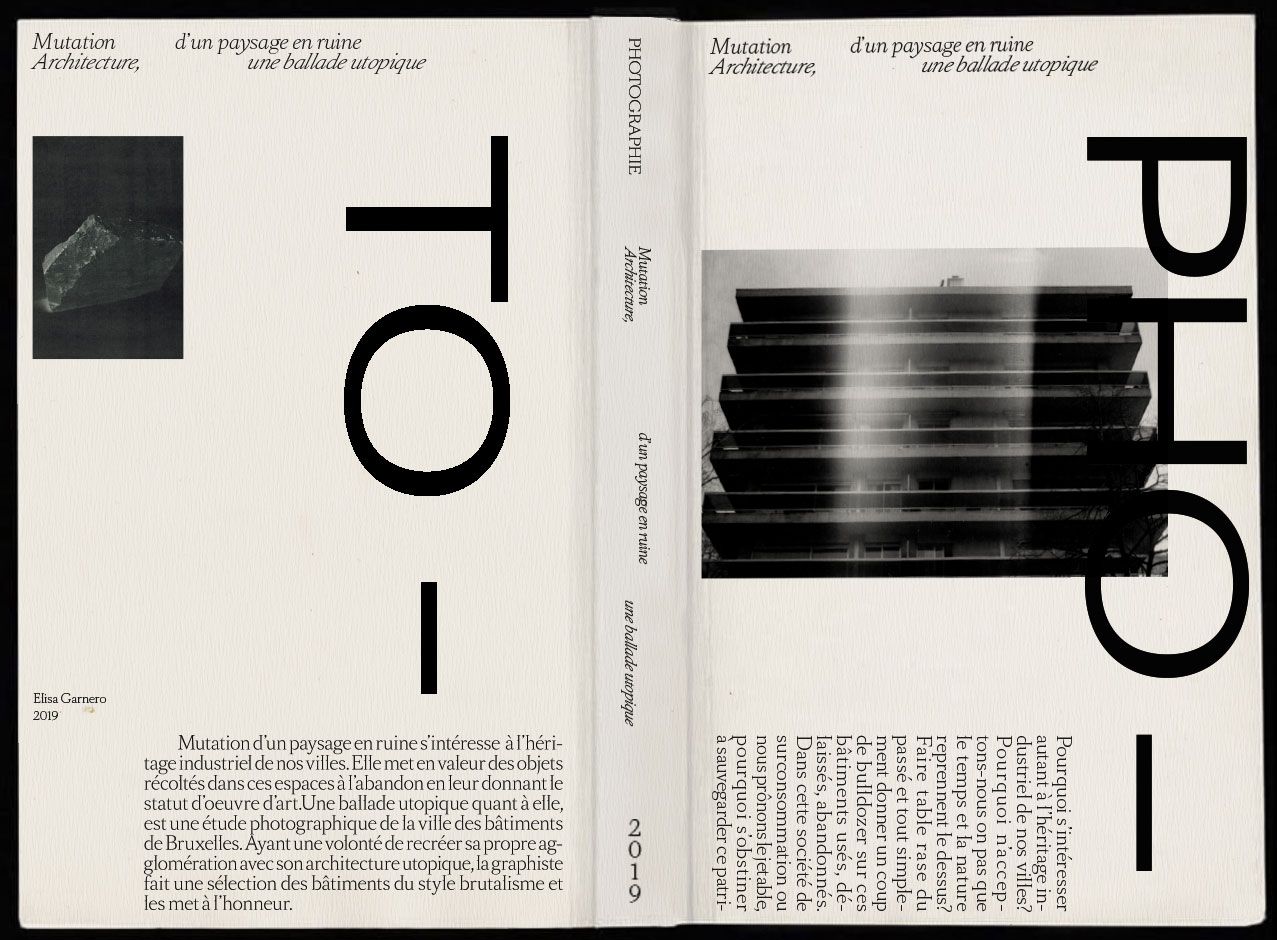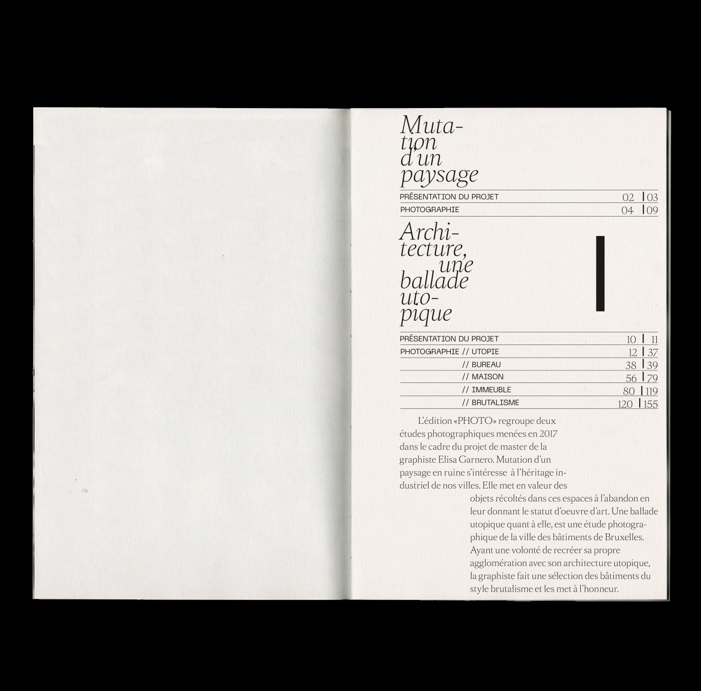 L’édition «PHOTO» regroupe deux études photographiques menées en 2017 dans le cadre du projet de master de la graphiste Elisa Garnero. Mutation d’un paysage en ruine s’intéresse à l’héritage industriel de nos villes. Elle met en valeur des objets récoltés dans ces espaces à l’abandon en leur donnant le statut d’oeuvre d’art. Une ballade utopique quant à elle, est une étude photographique de la ville des bâtiments de Bruxelles.